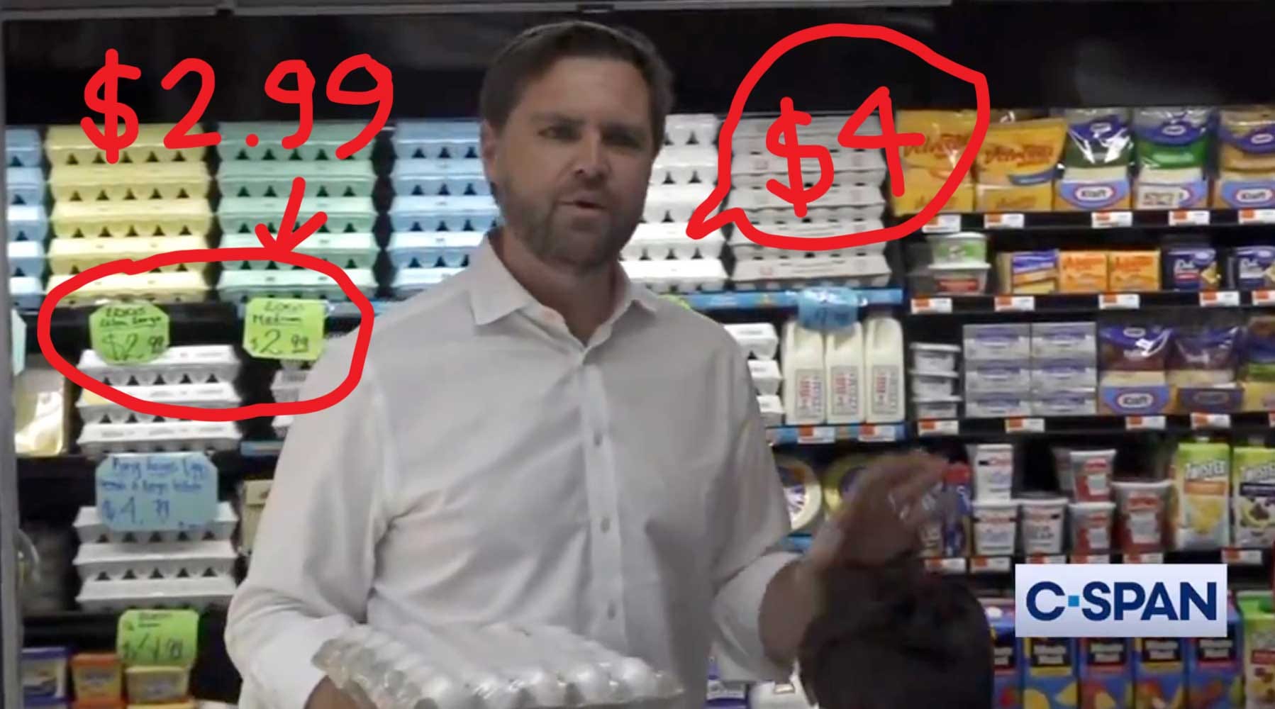 Vance, fresh off spreading a cynical lie about pet-eating immigrants, stepped into a stage-managed scene designed to lay the high price of eggs at Harris’s feet. There was just one problem … the campaign staffer responsible for “blocking and staging” the scene failed to notice a glaring issue with the backdrop. Vance made his sales pitch about Kamala’s $4.00 eggs in front of a display case featuring $2.99 eggs … a fact that’s highlighted in this *enhanced* photo from Boing Boing: