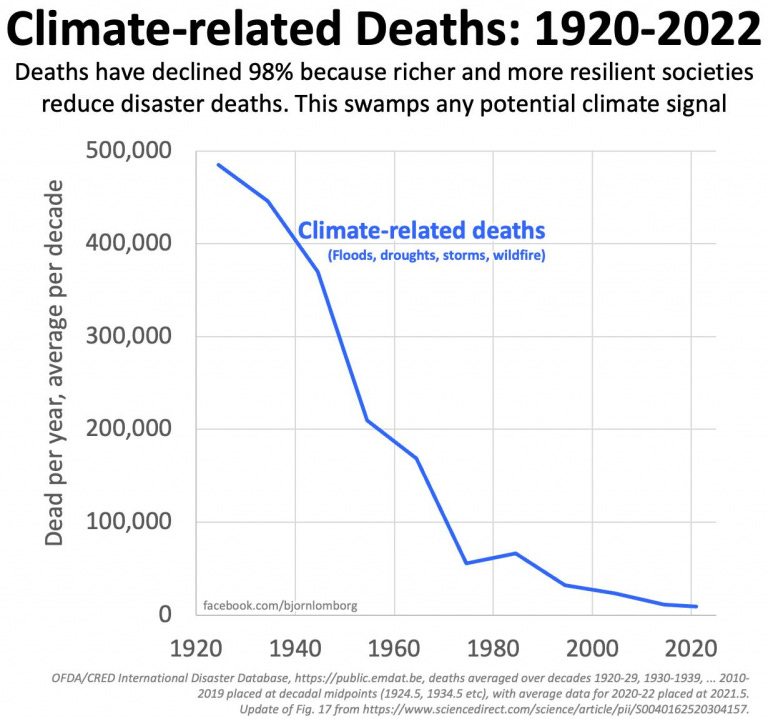 EXCERPT: The thing that prompted this column was a misleading infographic [Bjorn] Lomborg posted on Facebook, summarizing data from his article “Welfare in the 21st century: Increasing development, reducing inequality, the impact of climate change, and the cost of climate policies” (Technological Forecasting and Social Change, July 2020). The gist of it, as he summarizes in his Facebook post, is that “about 98% fewer people died in 2022 than a hundred years ago from climate-related natural disasters like floods, droughts, storms, and wildfires…. Over the past hundred years, annual climate-related deaths have declined by more than 98%.”