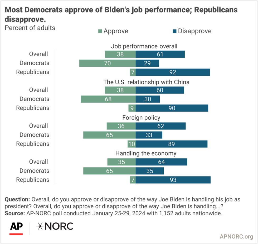 Thirty-eight percent approve of Biden’s job performance, including 70% of Democrats and just 7% of Republicans. The public has similar opinions about how the president is handling foreign policy in general, and specifically relations with China, as well as the economy.