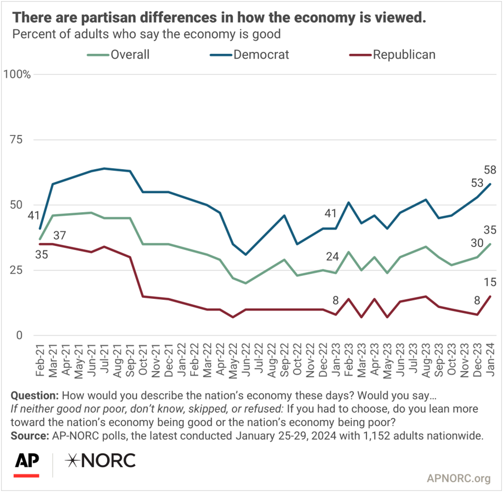 Thirty-five percent say the national economy is good, up slightly from 30% in an AP-NORC poll conducted in December and 24% in January 2023. The economy is seen as poor by 65%, down from 69% in December and 76% a year ago. Both Democrats and Republicans are more likely to describe the economy as good compared with last January. But, while 58% of Democrats now have a positive opinion of the economy, only 15% of Republicans agree.