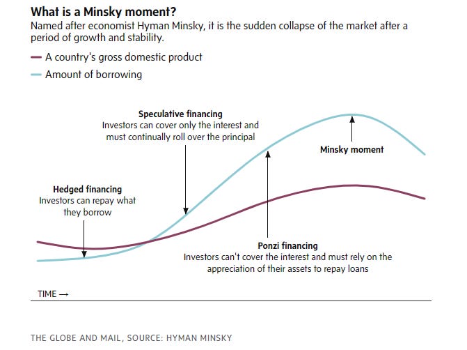 The housing bubble and subsequent crisis seemed to many to confirm Prof. Minsky’s thesis. It had followed a trajectory common in the annals of booms and busts: An irrational herd chases asset prices to unsustainable levels, fuelled by FOMO and imprudent borrowing. Eventually, general risk aversion sets in, teeing up a panic. All that’s needed is a shock – rumours of a major default, a surprise hike in interest rates, a political crisis – to spook the market herd and cue the Minsky moment. Then comes the collapse in prices, the liquidity crisis and recession – U-shaped or V-shaped, depending – topped off by a taxpayer-funded bailout of the people who burned the house down.