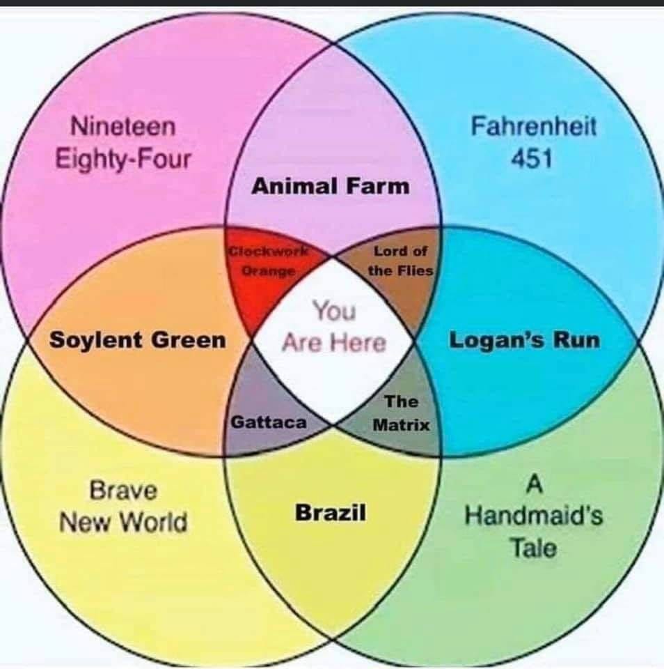 THE SET-UP: Here’s some “meta-Level” irony for you. If you still scroll through one or more social media feeds you’ve probably seen one of those frighteningly prescient Sci-Fi/Dystopia Venn Diagrams. Like this one: