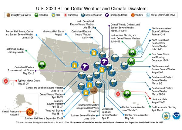 The National Oceanic and Atmospheric Administration reported a record number of billion-dollar disasters in the U.S. in 2023 — 28 in all. That includes a hurricane in Guam and fires in Hawaii. But the other 26 cut a swath across the country stretching from Texas to Maine, including flooding, hail, fire, a hurricane and severe weather events in summer and winter, leaving destruction and soaring insurance costs in their wake.