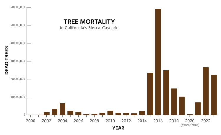 To date, tree mortality has disproportionately impacted large pines in the southern Sierra where more than a quarter of live trees are estimated to have died between 2012-2016. Signs of a new tree mortality event emerged in 2021 and 2022, this time among higher-elevation fir forests in the northern and central Sierra-Cascade.