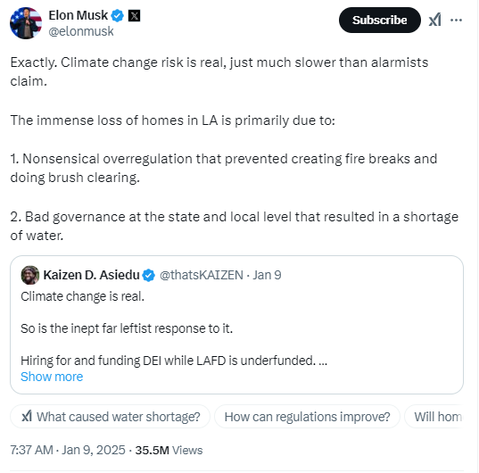 If Elon was a “genius” and he knew the “science” he’d know full-well that the risk is not “much slower.” In fact, it’s the exact opposite of “much slower.” Climate scientists around the world are now grappling with evidence that the change is accelerating. And it could be that they were not alarmist enough. But no … the “genius” has assured deniers and bigots everywhere that they are right … the devastation of the L.A. Fires is due to DEI and lesbian firefighters and the Delta Smelt and a panoply of culture war hot-buttons and dog whistles.