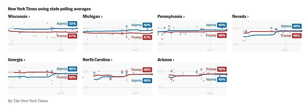 To wit, the NYTimes/Siena poll found that stark divide reestablished in all the swing states. Michigan, Pennsylvania, Georgia, North Carolina and Arizona are within a one or two points. Not too far afield is Wisconsin, where Harris up by three.