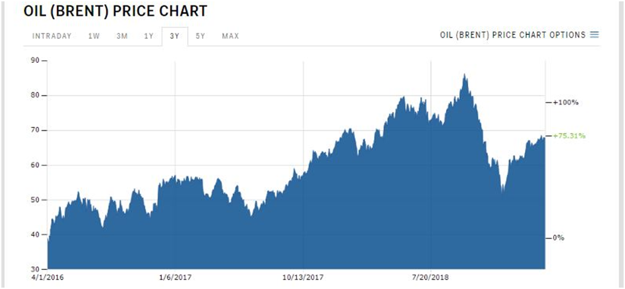 Heck, even without the new, production-altering sanctions, the chart below shows the significant “Trump Effect” on the price of oil since April 2016 (in this case Brent, which, along with the West Texas Intermediate referenced above, is one of the two “benchmark” oils). And just look at the price since Trump took office to see why MBS and Putin high-fived at the G20.